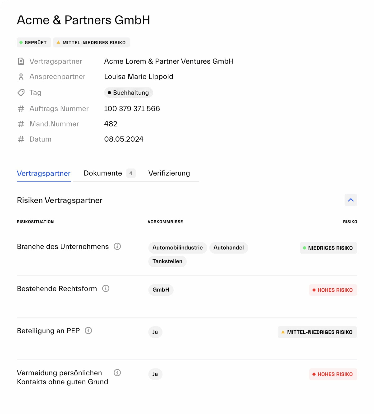 Je nach Art des Vertragspartners (natĂĽrliche oder juristische Person) mĂĽssen Name, Geburtsdatum, Anschrift, Ausweisdokumente und wirtschaftlich Berechtigte erfasst werden. Bei Unternehmen kommen HandelsregisterauszĂĽge, Vertretungsberechtigungen und EigentĂĽmerstruktur hinzu.